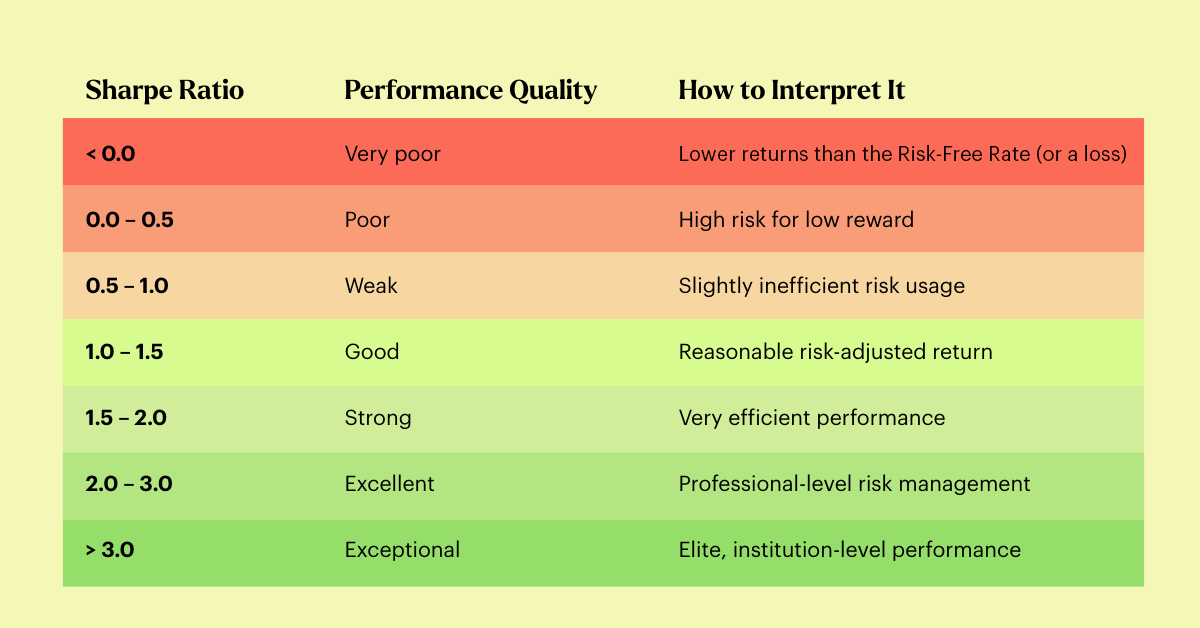 The interpretation of a Sharpe ratio is not 100% set in stone, and it is up to the investor or trading firm to define what they deem appropriate. But what is certain is that a higher Sharpe means more efficient use of risk. Below you will find an overview of generally accepted ranges by trading firms to judge quality, from “not worth the risk” to “institutional-level performance.”