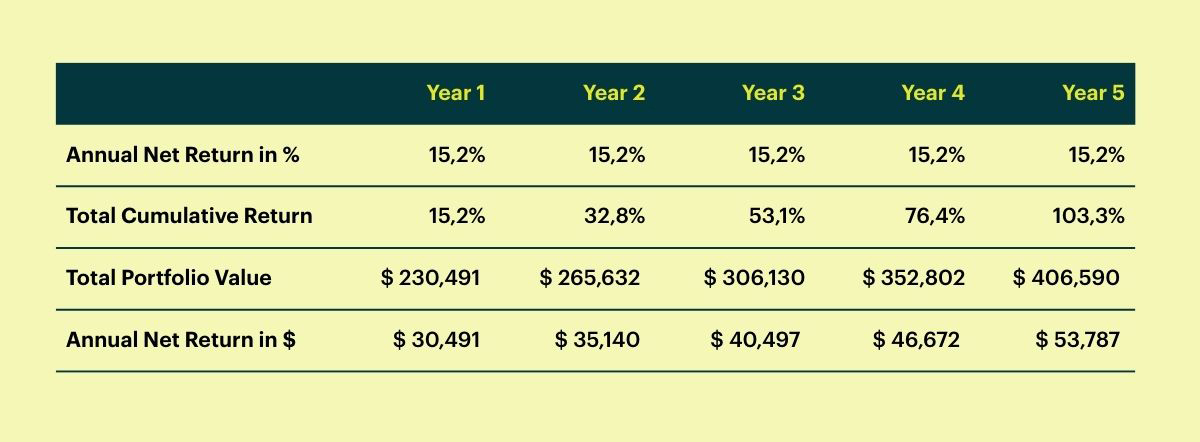 If the investor chooses to reinvest these returns, the benefit of compounding begins to work. In that case, a net annual return of 15.2% would lead to a net investment result of $53,787 in the fifth year.