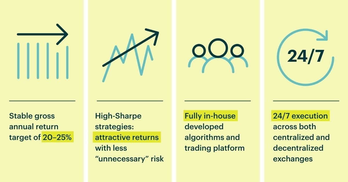 One of the biggest advantages of the crypto market is that inefficiencies occur more frequently and tend to persist longer than in traditional markets. This makes crypto particularly suitable for high-Sharpe strategies: strategies that aim for an optimal balance between return and risk.